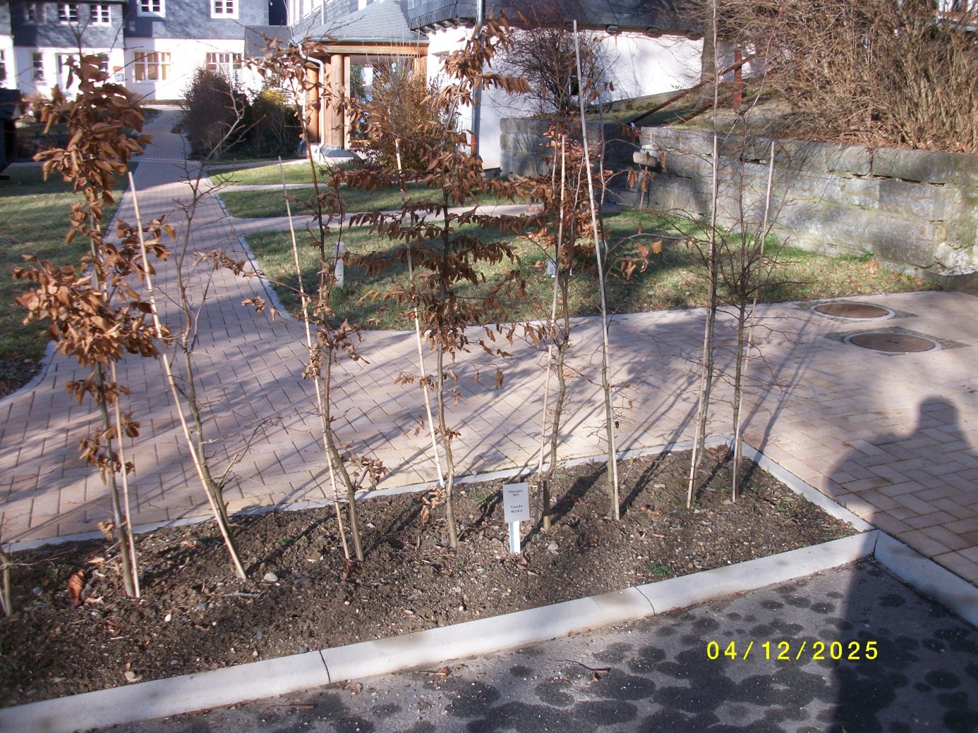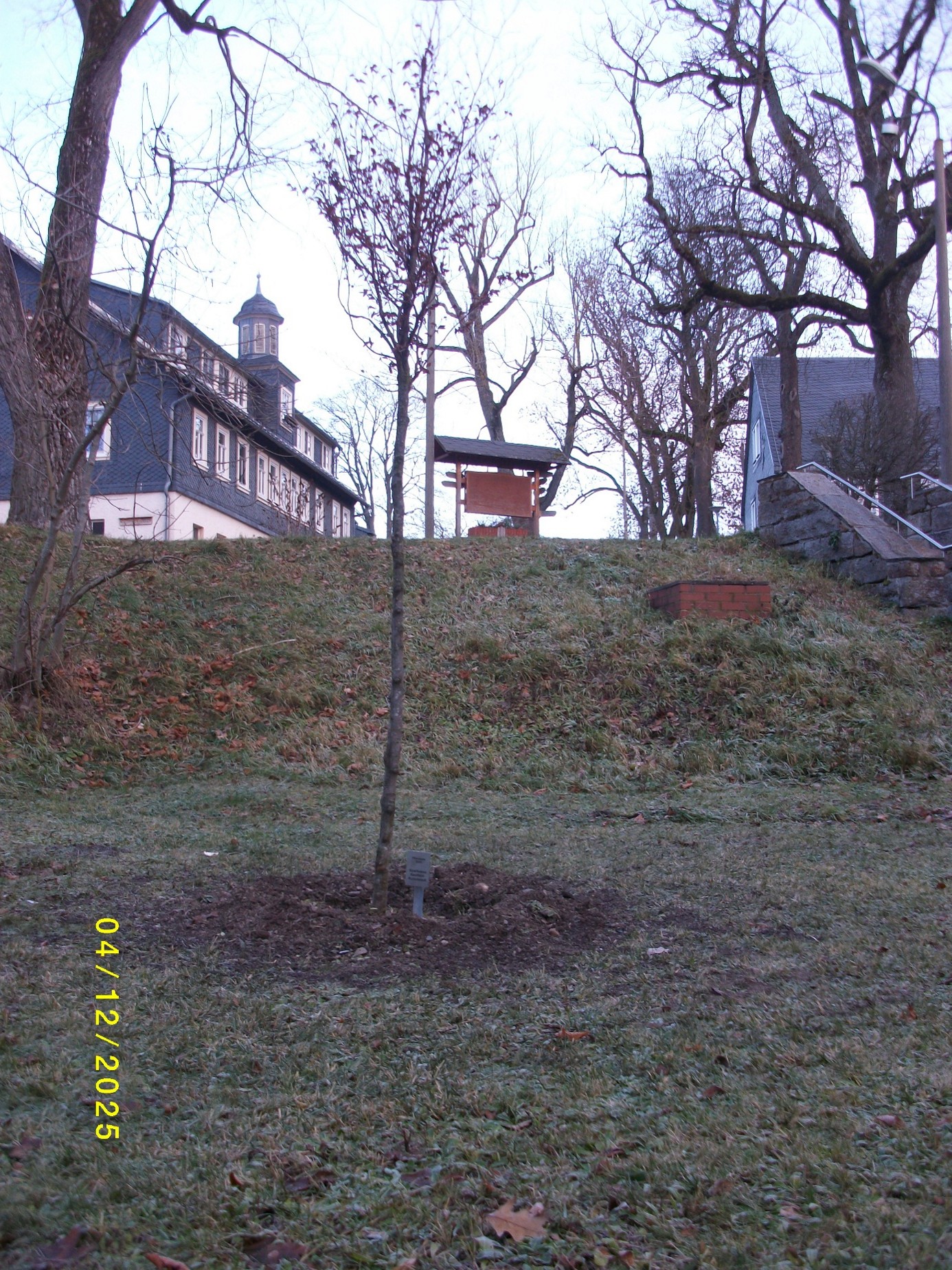 Am Ende November konnte nun auch der von der Kreissparkasse Saalfeld-Rudolstadt gesponserte Kastanien-Baum seinen endgültigen Platz in der Lebensgemeinschaft finden. Ebenso wie auch alle anderen Starkbäume nach und nach gepflanzt werden konnten. Die Pflanzkonzeption wurde damit umgesetzt. Da sich nun noch einige weitere Pflanzpaten gemeldet und Geld gespendet haben, werden im Frühjahr, vor allem im Bereich des Ersatzparkplatzes noch weitere Pflanzungen vorgenommen werden können.